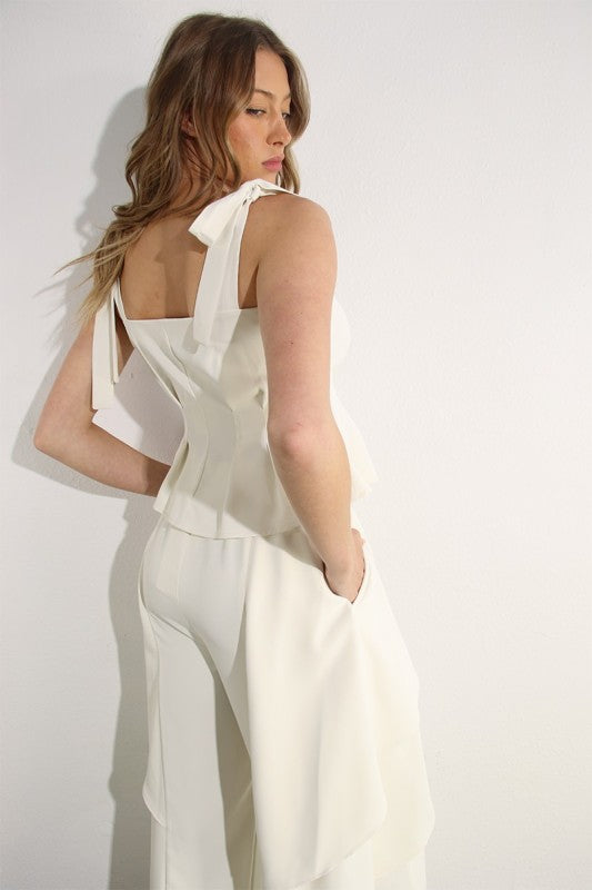 Un conjunto sofisticado y moderno que eleva tu estilo al instante. Este set en tono ivory presenta un top estructurado sin mangas con delicados pliegues frontales y un favorecedor volante en la cintura que aporta movimiento y feminidad. Se combina con un pantalón de pierna ancha de caída fluida y detalle de volante lateral que estiliza la silueta con elegancia.